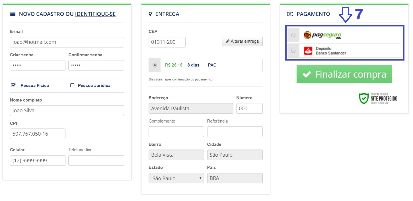 7. Preencha o dados cadastrais e selecione uma forma de pagamento (com o PagSeguro é possível parcelar e pagar com cartões de crédito, débito, transferência bancária ou boleto)